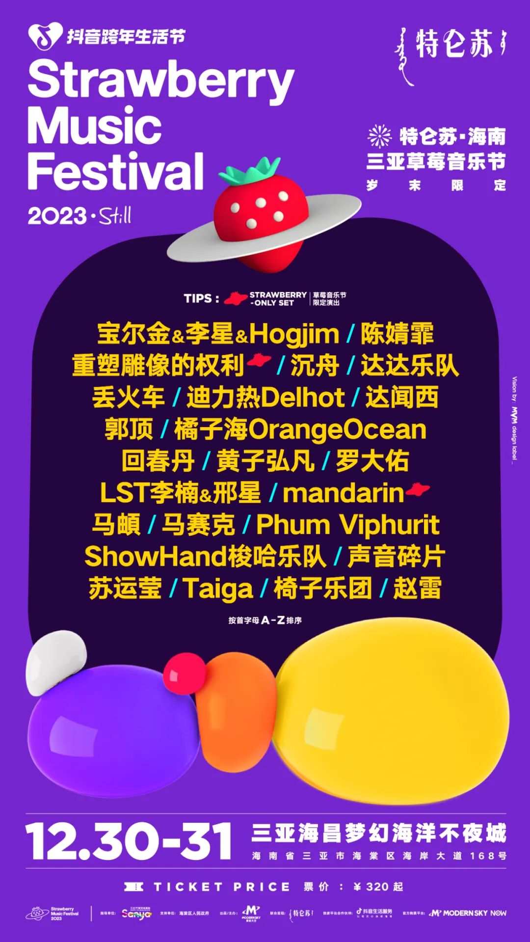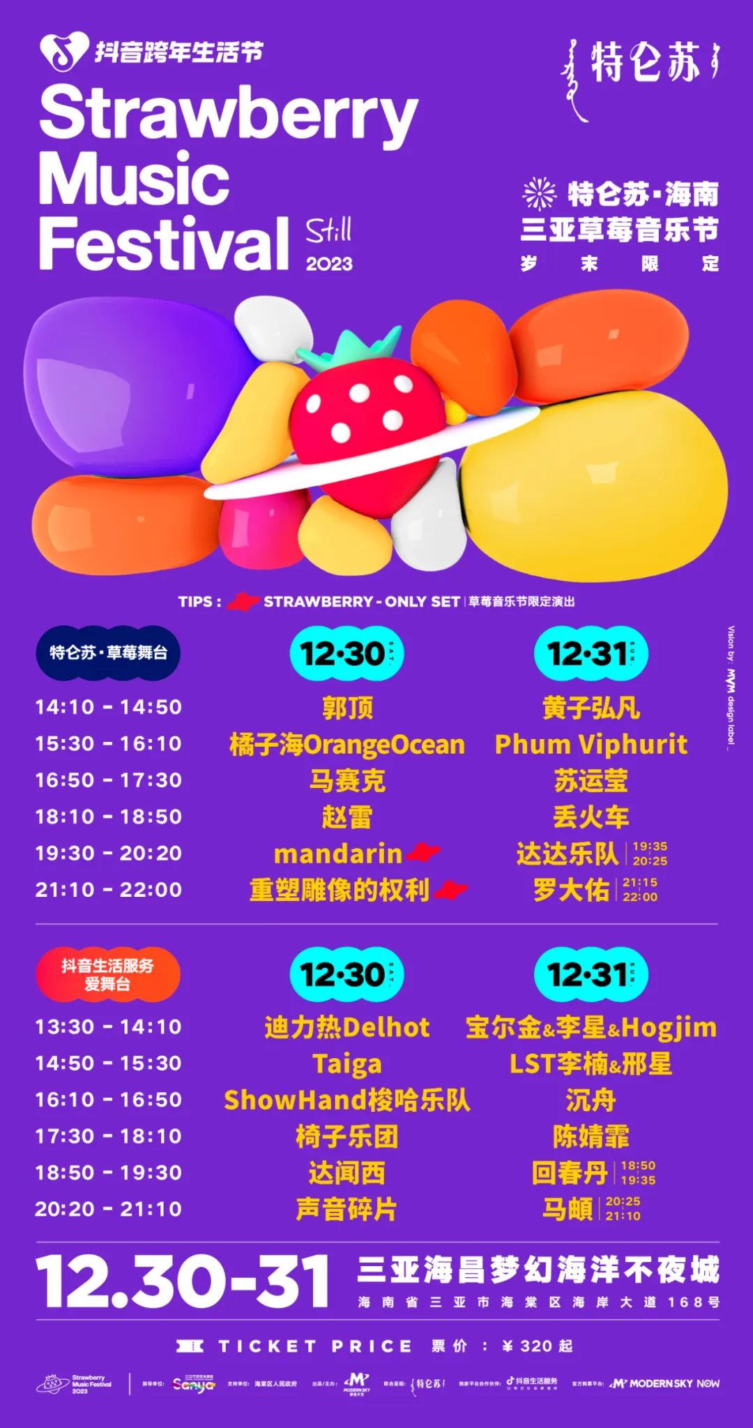重塑雕像的权利、近两年来首次合体演出的mandarin乐队,将带来「草莓音乐节限定演出」。朗朗上口的旋律中,声音碎片、丢火车、回春丹、达闻西将给你关于生活的深思内省与向往。达达乐队、马赛克、椅子乐团、橘子海OrangeOcean浪漫与热情兼备的现场将让你的跨年假期快乐加倍。新生代乐队ShowHand梭哈、沉舟、迪力热Delhot年轻、直接的表达和你一起冲向2024!