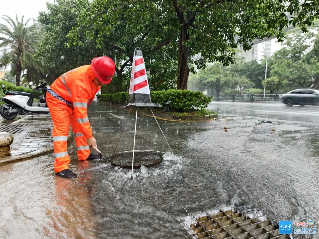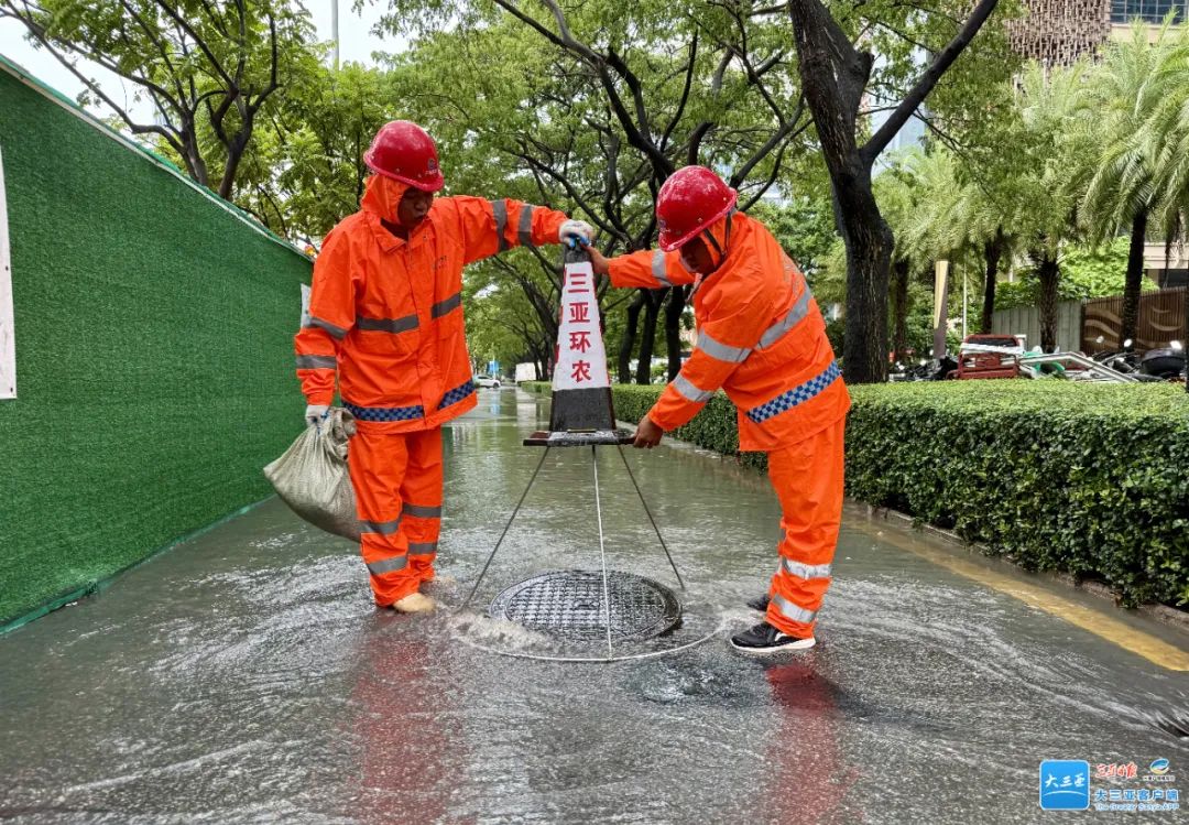 8月18日下午,在吉阳区荔枝沟路乐天城段,市政工人在值守排水。