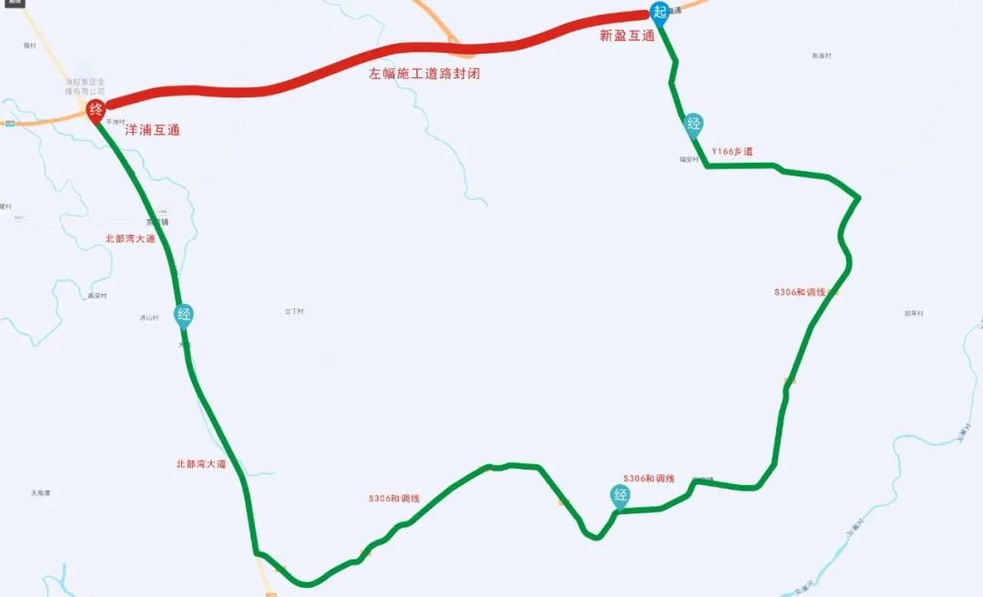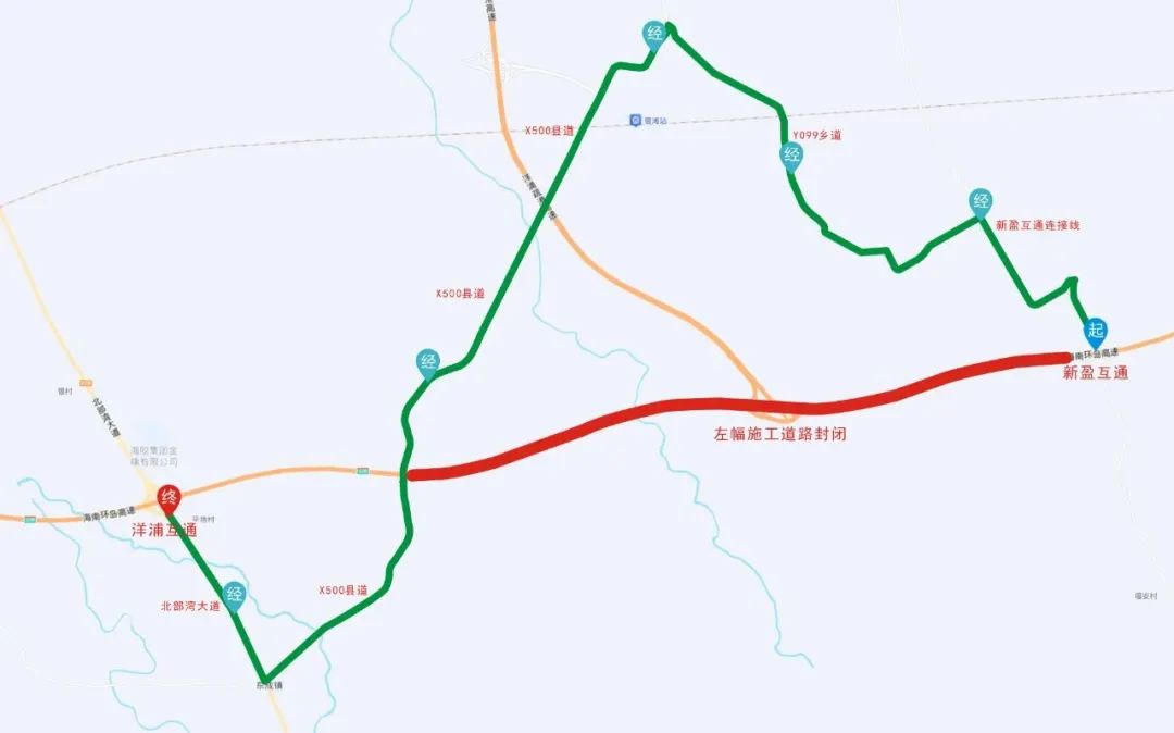 因洋浦疏港高速公路工程新建石牌互通对G98环岛高速K520+538天桥进行拆除施工的需要,2025年8月22日至2025年8月25日(每日作业时间:07:00至16:30),封闭G98环岛高速新盈互通至洋浦互通段左幅(海口往三亚方向)车道,由海口往三亚方向的车辆从新盈互通下高速→新盈互通连接线→Y099乡道→X500县道→S308美洋线(北部湾大道)→洋浦互通重新上高速公路往三亚方向;或选择从新盈互通下高速→Y166乡道→S306和调线→S308美洋线(北部湾大道)→洋浦互通重新上高速公路往三亚方向。