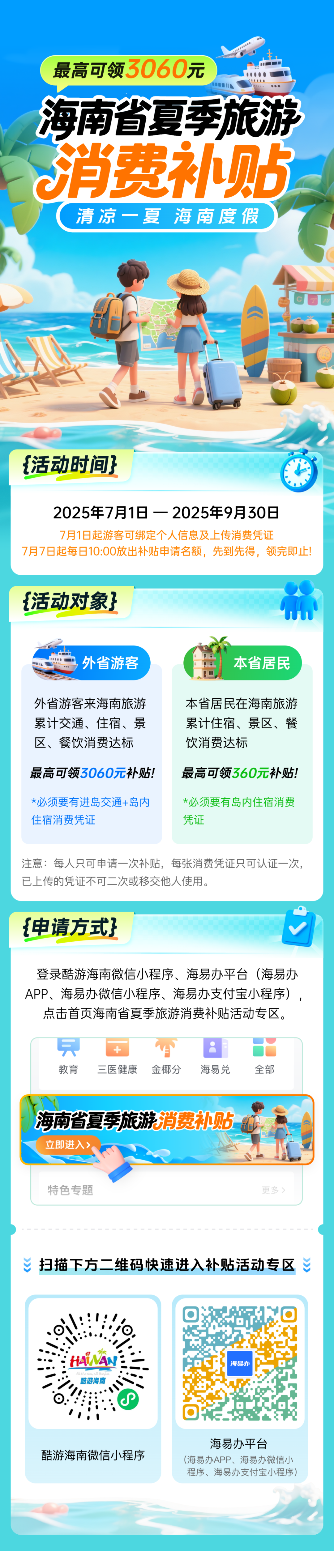 据悉,此次海南夏季旅游消费补贴活动是海南省全年最大规模的暑期文旅补贴行动,从2025年7月1日起,活动面向省内外游客发放4000万元夏季清凉补贴,涵盖进出岛交通费用、省内住宿消费、4A级(含)以上景区门票费用、餐饮消费等类目。