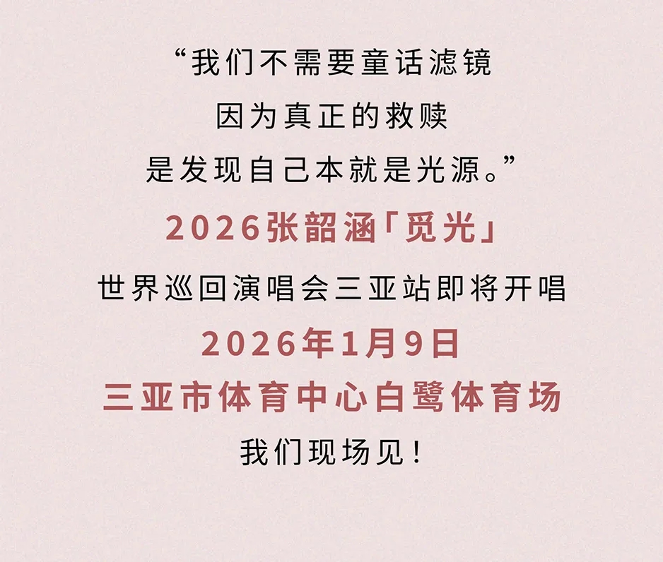 张韶涵“觅光”世界巡回演唱会三亚站官宣!2026年1月唱响天涯
