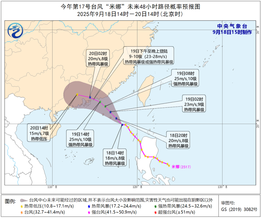 预计,“米娜”将以每小时15~20公里的速度向西北方向移动,强度逐渐增强,并将于19日下午至晚上在广东汕尾到深圳一带沿海登陆(23~28米/秒,9~10级,热带风暴级或强热带风暴级),登陆后继续向西北方向移动,强度逐渐减弱。受其影响,18日下午~19日,南海中部和北部的大部分海域风力6~8级、阵风9~11级;中沙群岛附近海面风力6~7级,阵风8~9级。