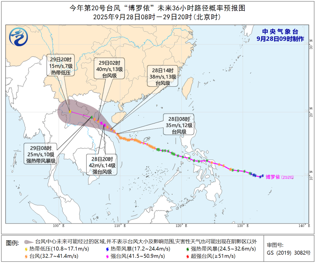预计,“博罗依”将以每小时25~30公里的速度向西北方向移动,强度略有加强,并于28日白天以台风级(35~40米/秒,12~13级)经过海南岛南部近海,之后将于28日夜间在越南中北部沿海地区登陆。