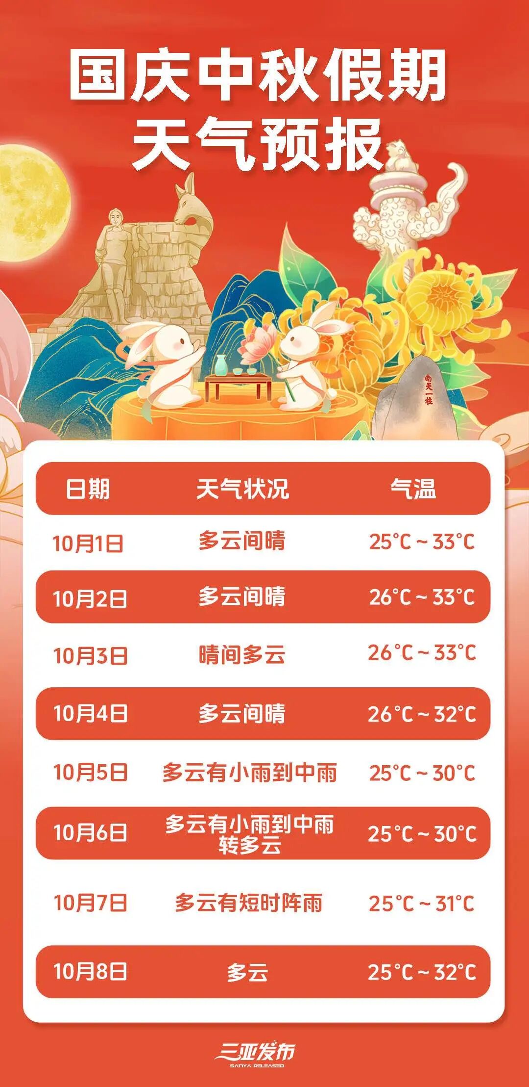 据三亚市气象局消息,预计,国庆中秋假日期间,三亚市大部分时段天气晴好,适宜户外活动;10月4日左右有热带气旋进入南海,5日向广东西部至海南岛东北部沿海地区靠近,受其影响,5-7日全市多云有小雨到中雨,其中5日局部大雨。