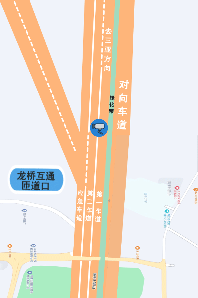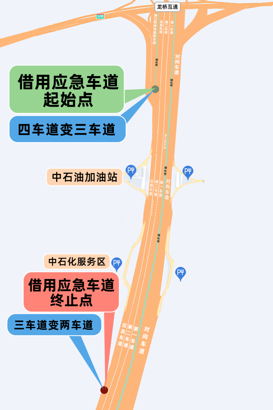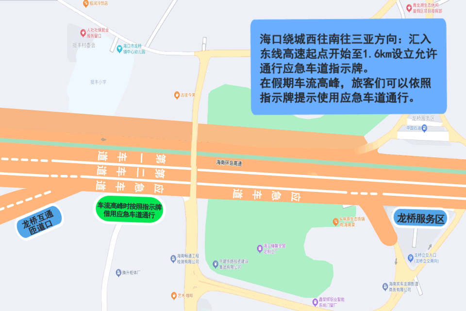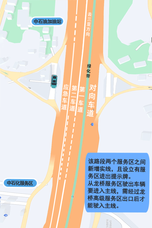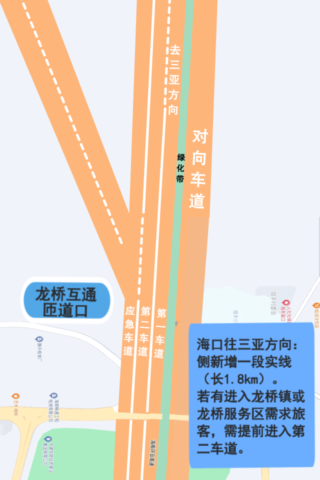 第一车道实线延长,减少车道变更导致的交织。海口往三亚方向侧新增一段实线(长1.8km)。若有进入龙桥镇或龙桥服务区需求的旅客,需提前进入第二车道。