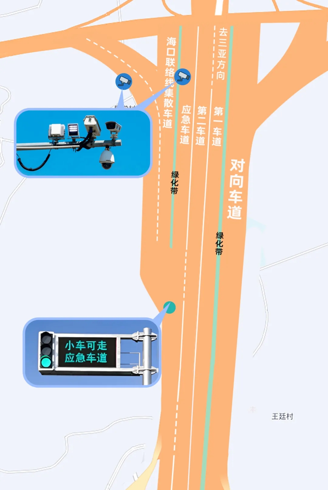 打开应急车道,缓冲车道数量的突变。海口绕城西往南往三亚方向,汇入东线高速起点开始至1.6km设立允许通行应急车道指示牌。