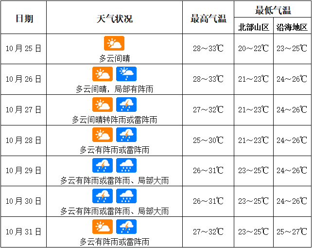 10月25日-26日,全市多云间晴,其中26日局部有阵雨;