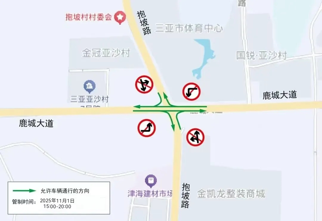 管制措施:沿抱坡路行驶的车辆通过路口只允许右转进入鹿城大道,禁止直行和左转;沿鹿城大道行驶车辆通过路口只允许直行或右转进入抱坡路,禁止左转。