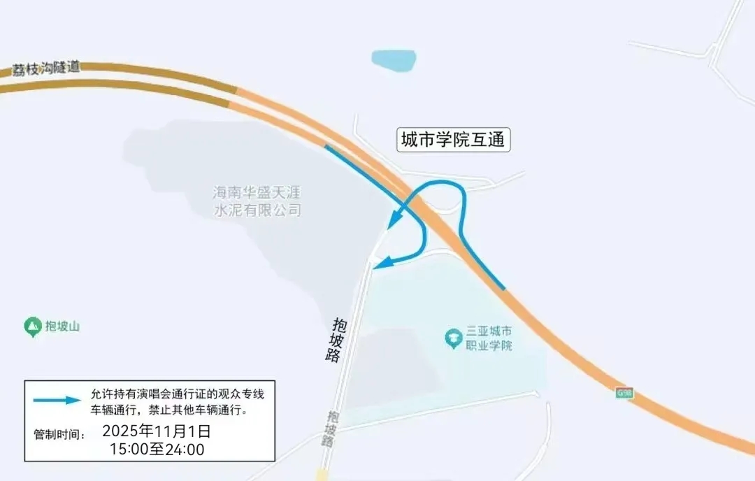 管制措施:除持有演唱会车辆通行证的观众专线车辆外,禁止其他车辆从G98高速城市学院互通下匝道进入抱坡路通行。