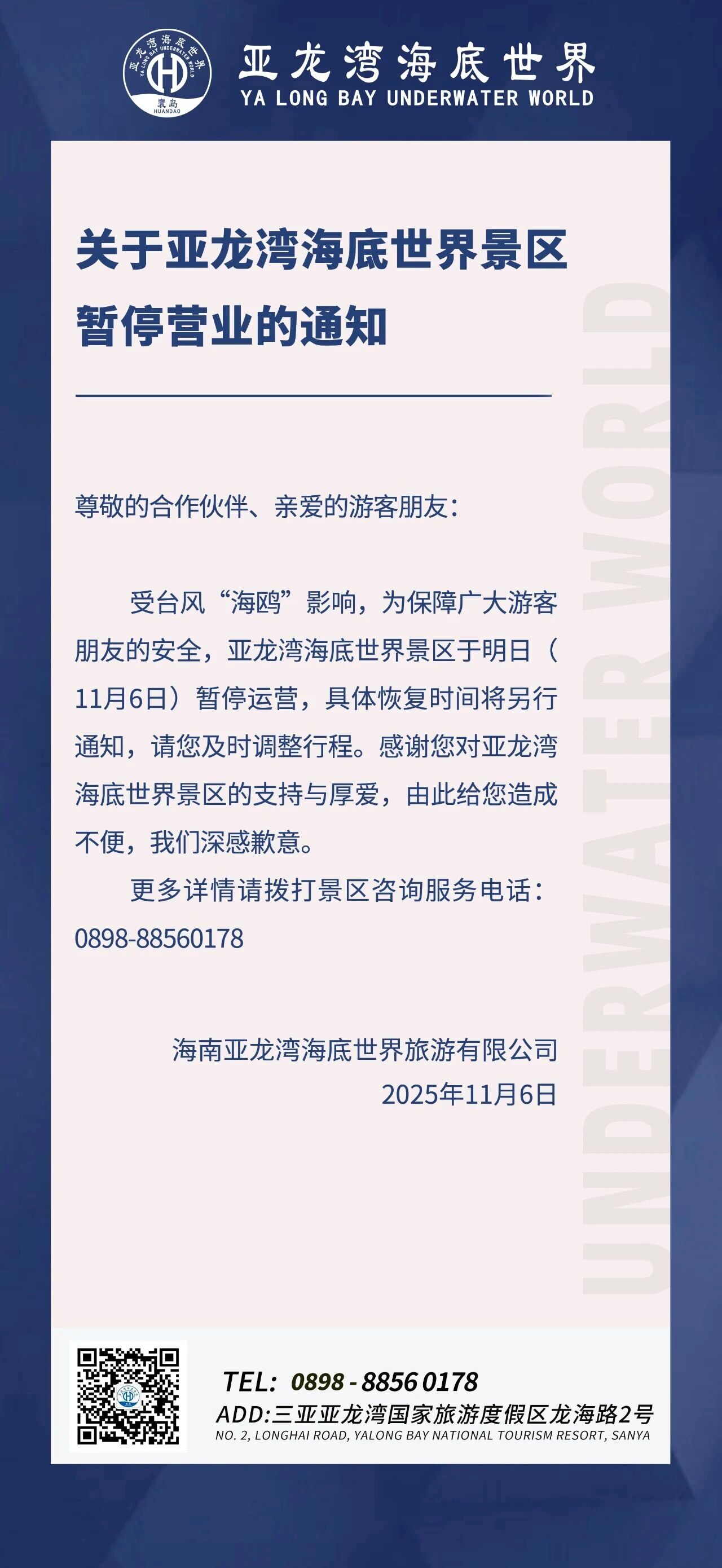 受天气影响,6日白天至7日夜间,三亚市近海海面,东北风6-7级、阵风7-8级,将给部分地区带来较强降雨影响,为降低第25号台风“海鸥”对海上交通的威胁,三亚海事局决定从11月6日08时起,除西岛、蜈支洲岛等陆岛抗风等级较大的船舶可以开航外,辖区其余游艇、渡船及抗风等级较低的涉客船舶禁止开航,复航时间视天气海况允许,另行通知。