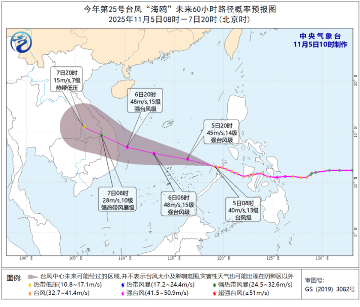 今年第25号台风“海鸥”已于5日14时加强为强台风级,16时其中心位于北纬12.0度、东经117.1度,也就是在三沙市永兴岛东南方向约745公里的南海东南部海面上,中心附近最大风力有14级(42米/秒),七级风圈半径250~330公里,十级风圈半径120~150公里,十二级风圈半径70公里。预计,“海鸥”将以每小时25公里的速度向西偏北方向移动,强度逐渐增强,最强可达15级,6日夜间趋向越南中部沿海登陆,之后强度逐渐减弱。