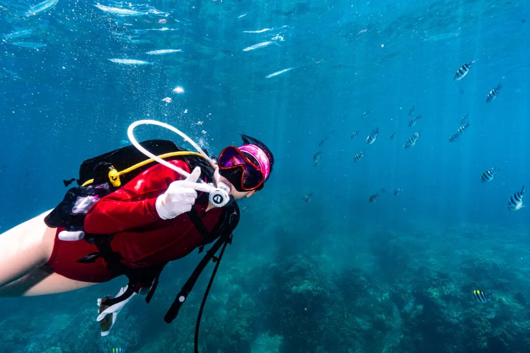 体验潜水内容:潜水理论培训和潜水技巧培训(呼吸规则、平衡压力、手势)。完成培训后由专业教练一对一带领,由教练控制体验海底风景,结束颁发PADI证书,赠送照片和视频。全程时长1.5小时-2小时。年满10周岁。费用含签证费、照片9张、冲淡、出海船只、潜水平台茶点、全套潜水装备、保险。