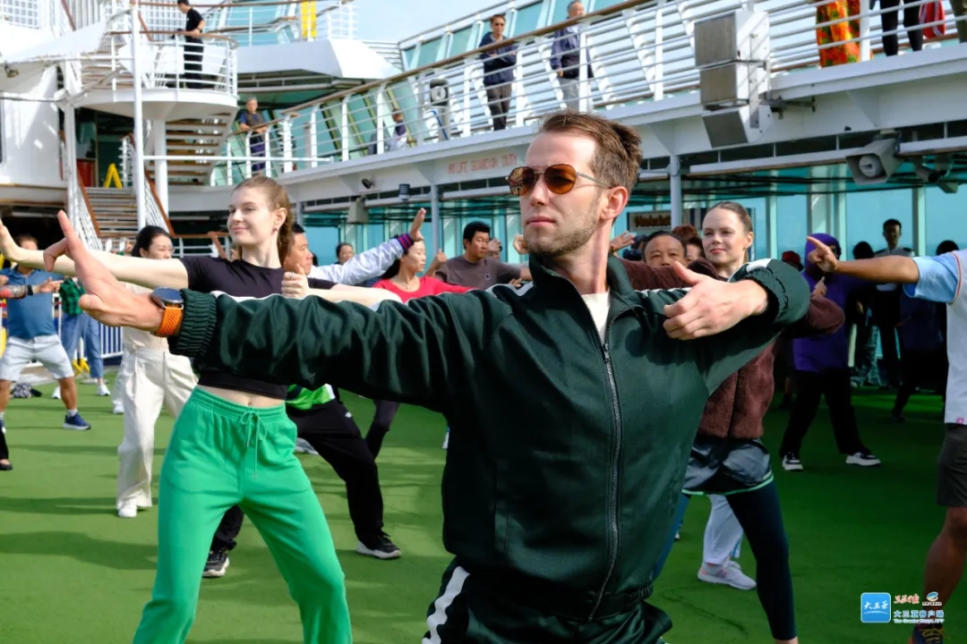 游客在“领航星”号邮轮甲板上跟随导师练习传统养生功法八段锦。
