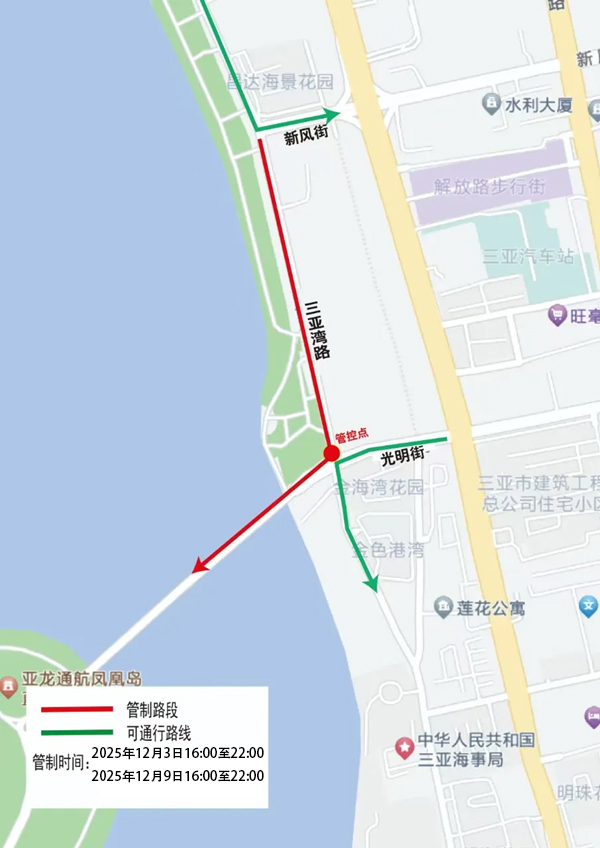 第七届海南岛国际电影节开幕式和闭幕式活动将于2025年12月3日和12月9日在我市凤凰岛举行。为确保开、闭幕式活动举办期间道路交通安全有序,根据《中华人民共和国道路交通安全法》有关规定,将在活动期间对三亚湾路(新风街路口至光明街路口)路段实行道路交通临时管制,现将有关事项通告如下: