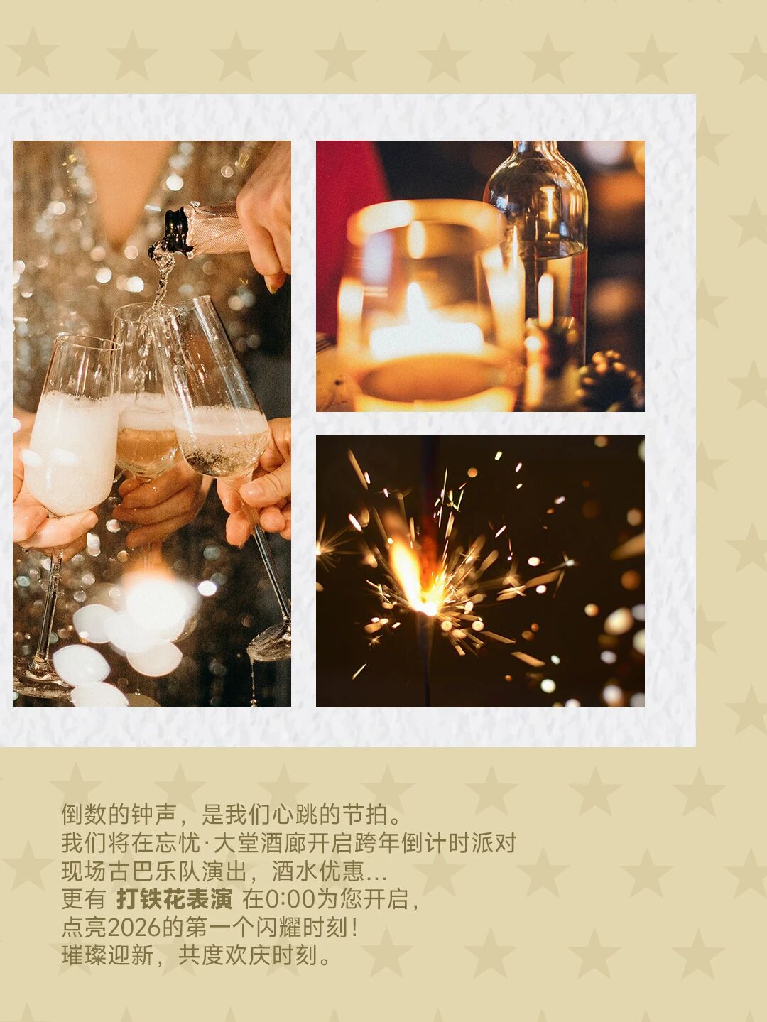 倒数的钟声,是我们心跳的节拍;我们将在忘忧·大堂酒廊开启跨年倒计时派对:现场古巴乐队演出,酒水优惠……更有打铁花表演在0:00为您开启,点亮2026的第一个闪耀时刻,璀璨迎新,共度欢庆时刻。