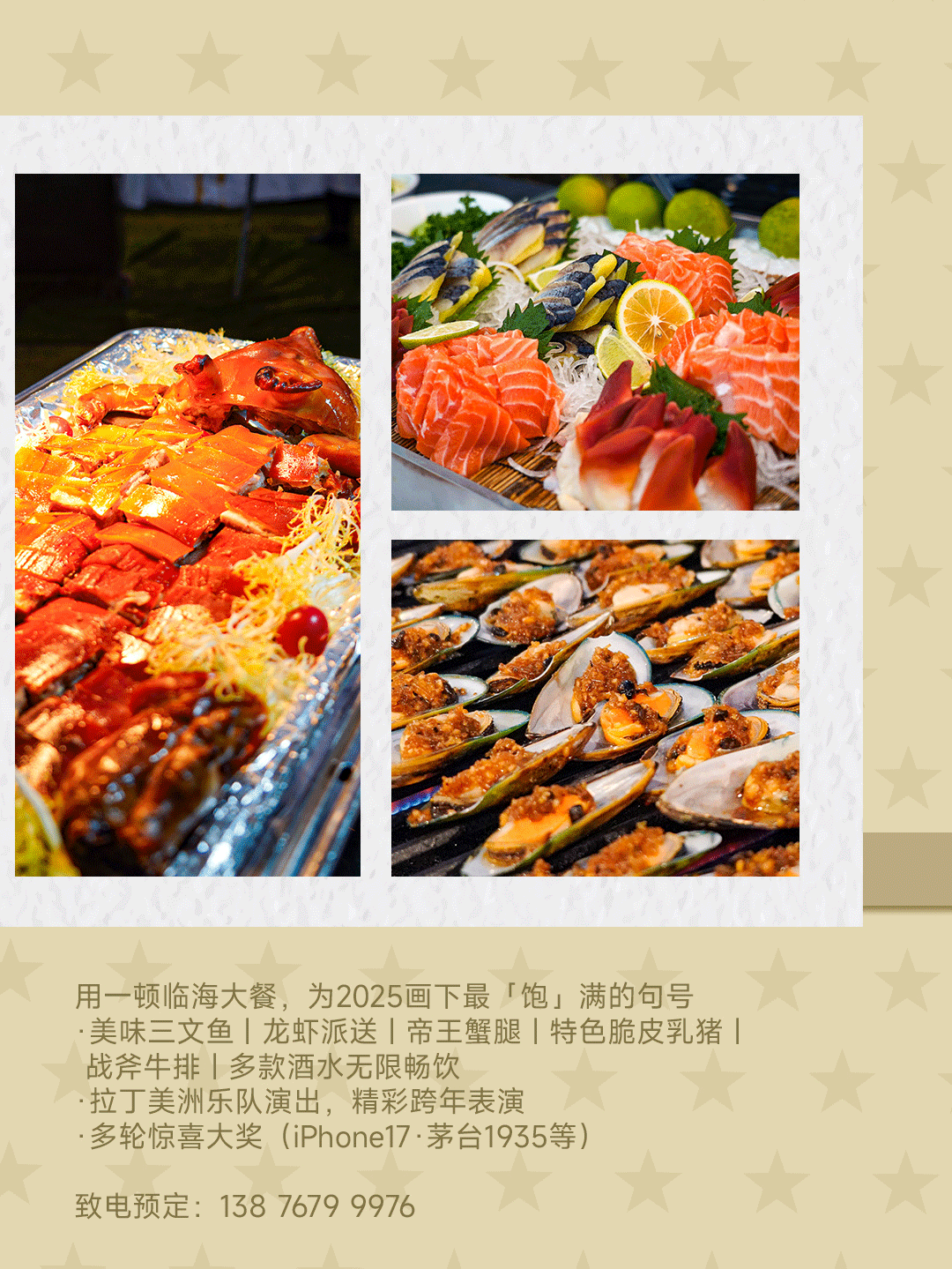 用一顿临海大餐,为2025画下最「饱」满的句号:美味三文鱼 | 龙虾派送 | 帝王蟹腿 | 特色脆皮乳猪 | 战斧牛排 | 多款酒水无限畅饮 | 拉丁美洲乐队演出,精彩跨年表演 | 多轮惊喜大奖(iPhone17·茅台1935等)