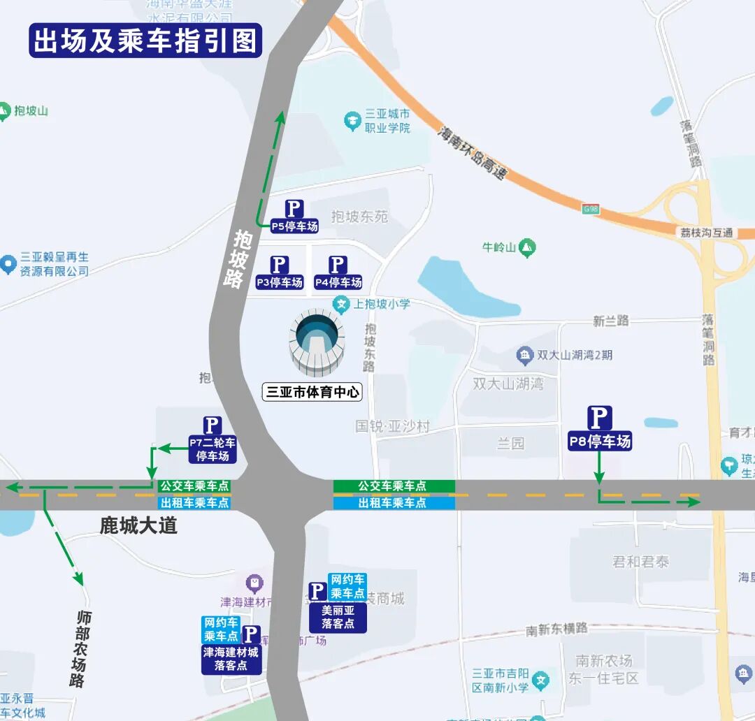 音乐会期间,三亚市体育中心体育场附近设有四个网约车上落客区,分别为津海建材城、美丽亚、P3停车场、P8停车场。