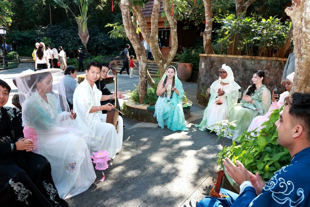 2026年1月1日,元旦佳节之际,三亚亚龙湾热带森林公园兰花谷“天涯物语、拾光里”影视拍摄基地迎来了一群特殊的客人。来自海南热带海洋学院的10多名外国留学生身着中国传统汉服,满怀好奇与热情,来到这里感受中华传统文化的独特魅力,以学习制作传统花灯、体验中国茶文化、欣赏蒙古族马头琴演奏表演等富文化特色的活动,迎接新年的到来。