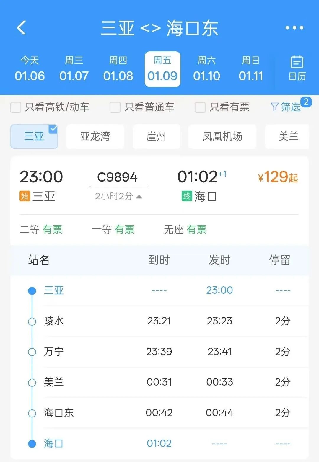 ▷ 路线:三亚始发,经停陵水、万宁、美兰、海口东,终到海口,全程高效直达