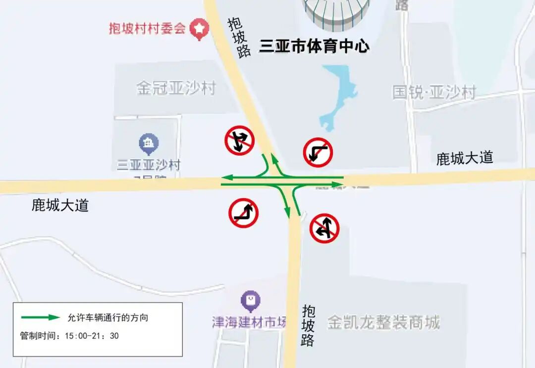 管制措施:沿抱坡路行驶的车辆经过该路口只允许右转进入鹿城大道,禁止直行和左转;沿鹿城大道行驶的车辆经过该路口只允许直行或右转进入抱坡路,禁止左转。
