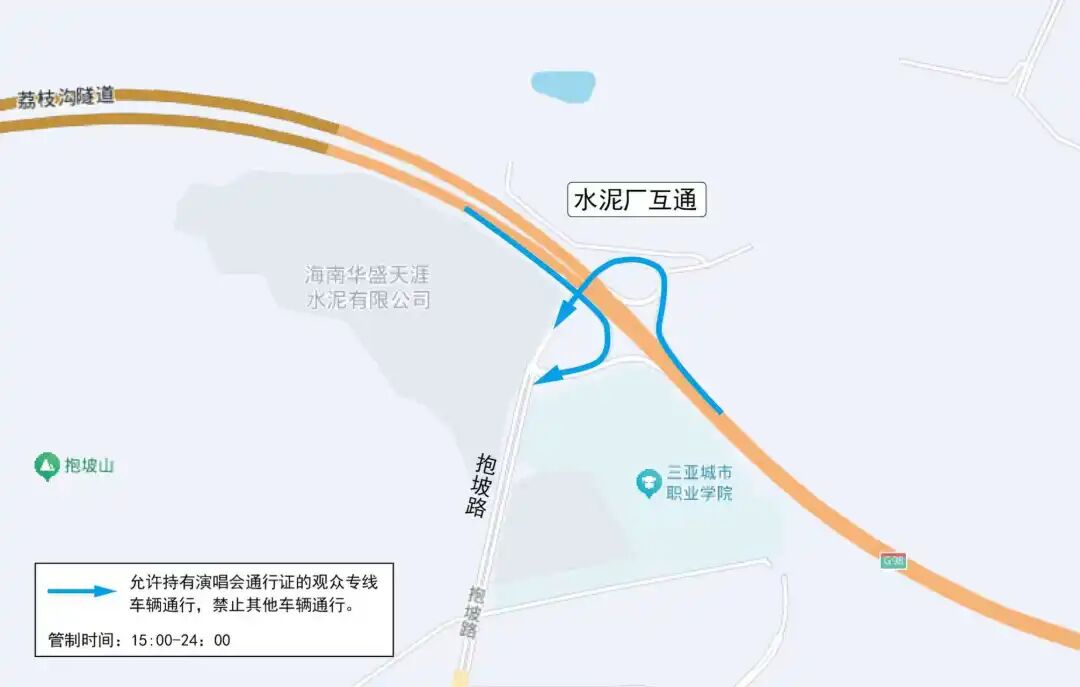 管制措施:除持有演唱会通行证的观众专线车辆外,禁止一切车辆从绕城高速进入抱坡路通行。