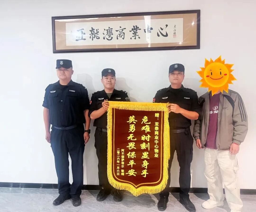 1月8日下午,一名男子将一面印有“危难时刻显身手,英勇无畏保平安”的锦旗送至亚龙湾亚泰商业中心物业管理部,表达对物业人员及时、专业救援的诚挚感谢。