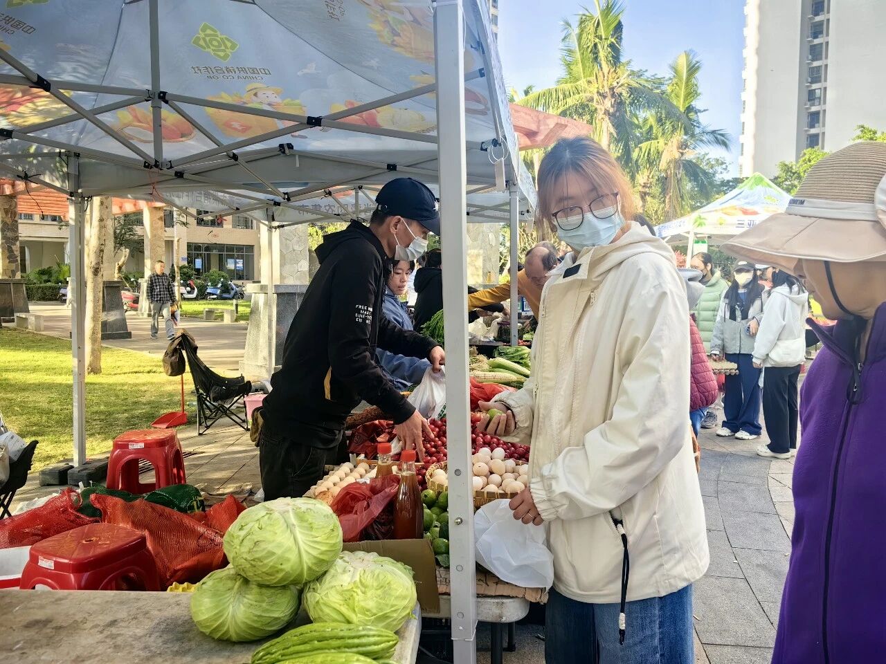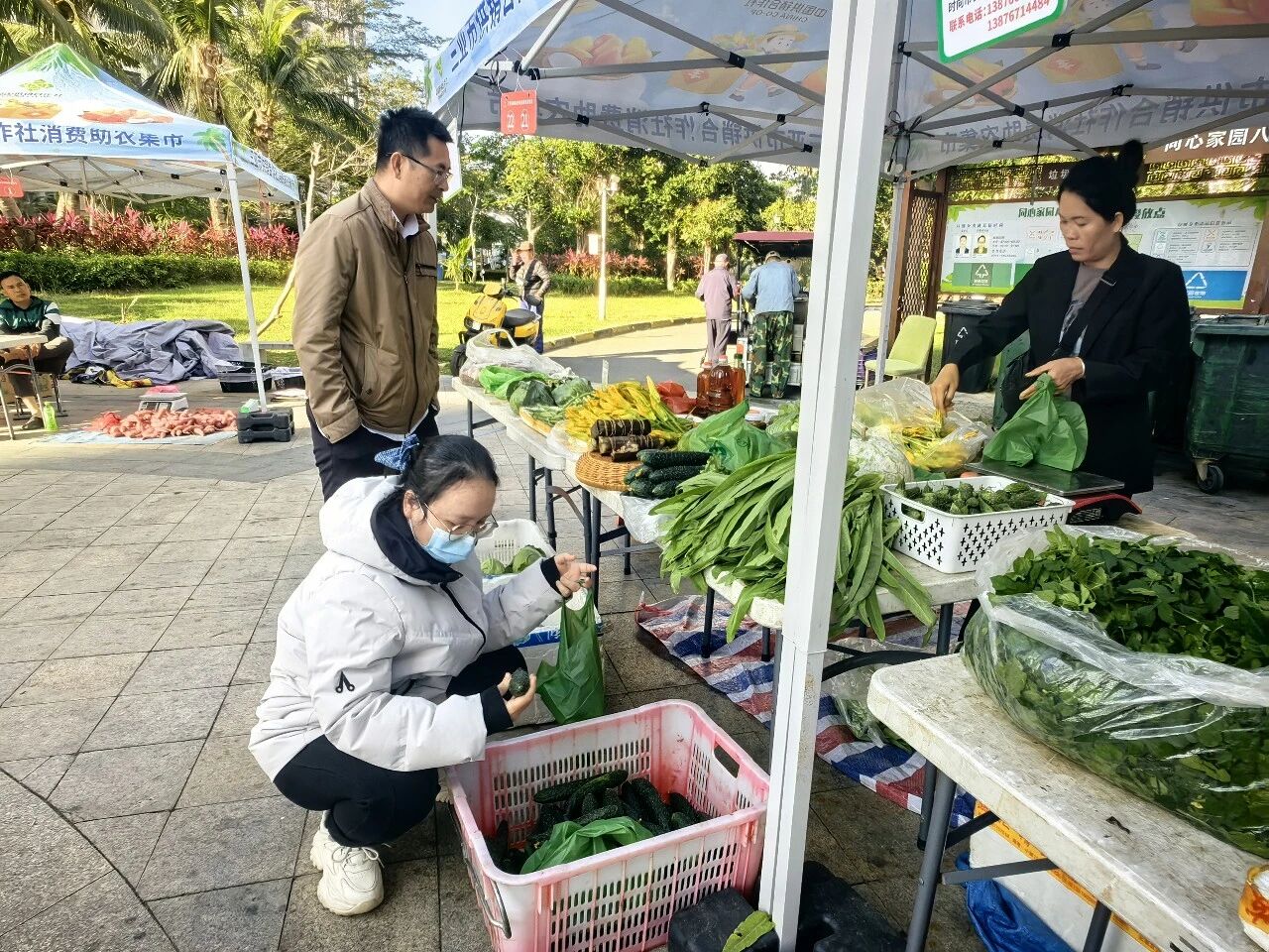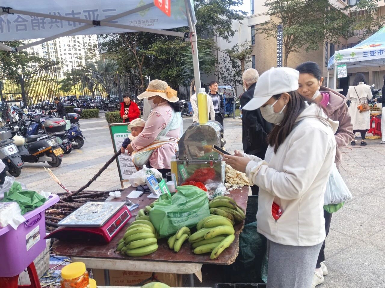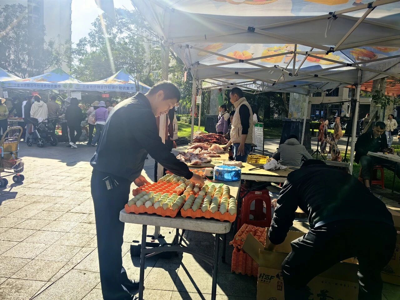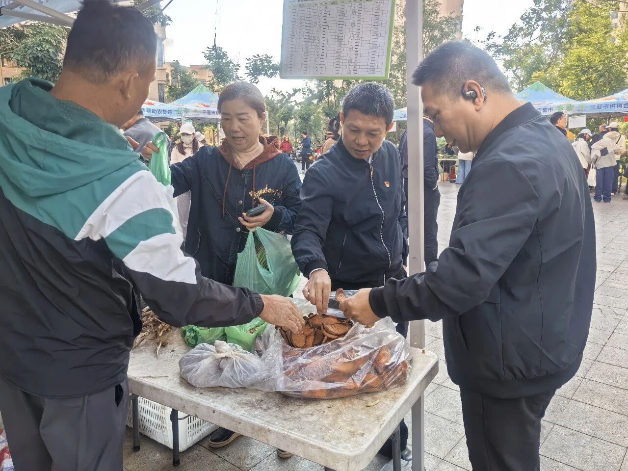 1月9日,在同心家园八期小区中心休闲广场上,一场满载温情的消费助农集市正热闹开集。浓浓的烟火气里,藏着农户们增收致富的期盼,更涌动着亚龙湾旅游度假区综合服务中心党支部传递的暖暖温情。