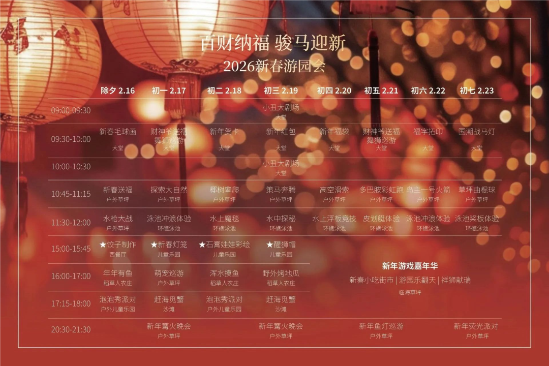 新年舞狮|鱼灯巡游|萌宠巡游|篝火晚会|赶海觅蟹
