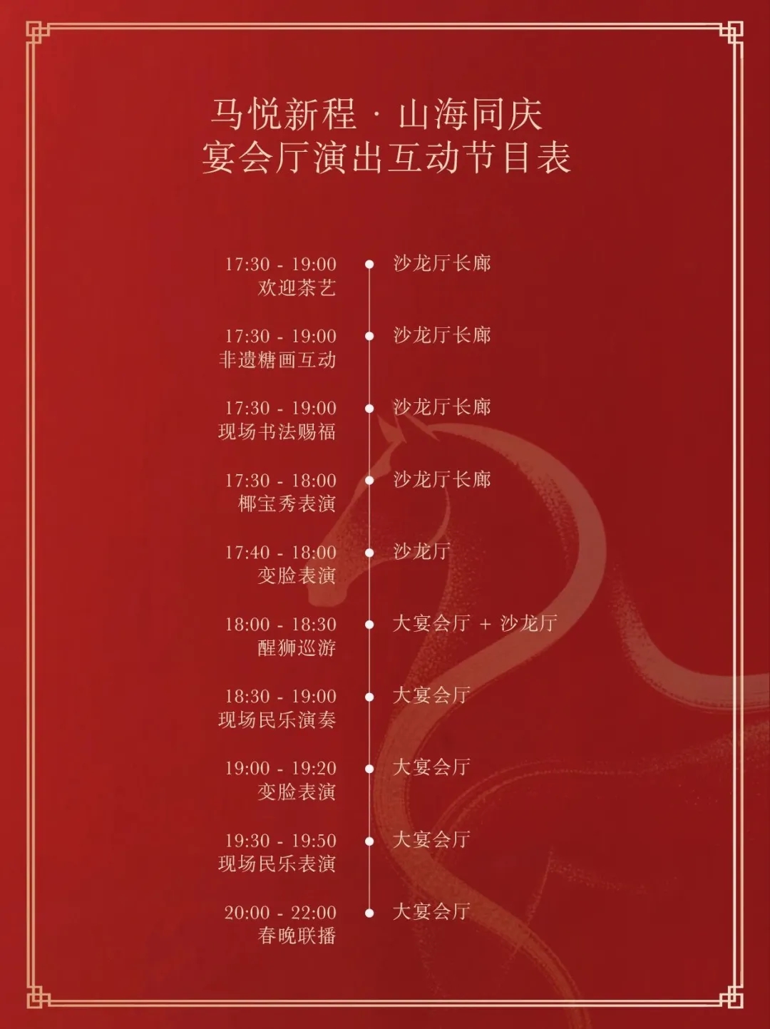 欢迎茶艺、糖画互动 、现场书法赐福、海南风情砍椰秀、舞狮表演、现场民乐演奏、大屏观看春节联欢晚会