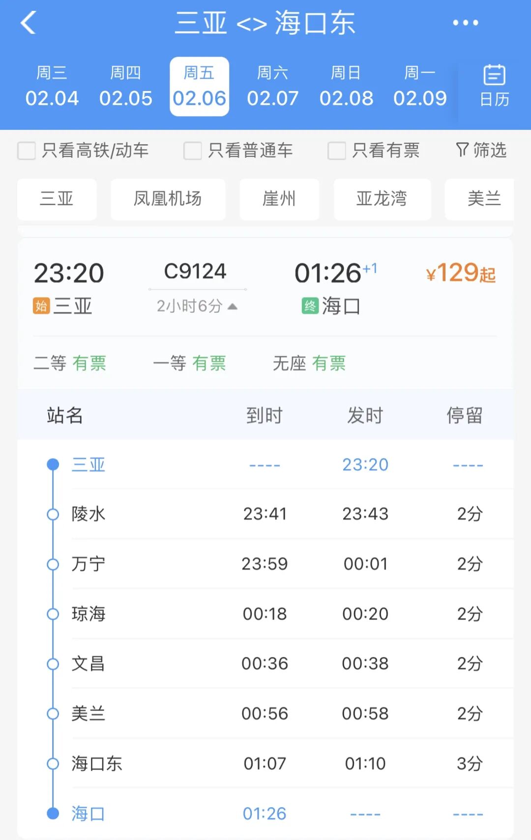 ▷ 行程时长:2小时6分钟,次日01:26抵达海口站