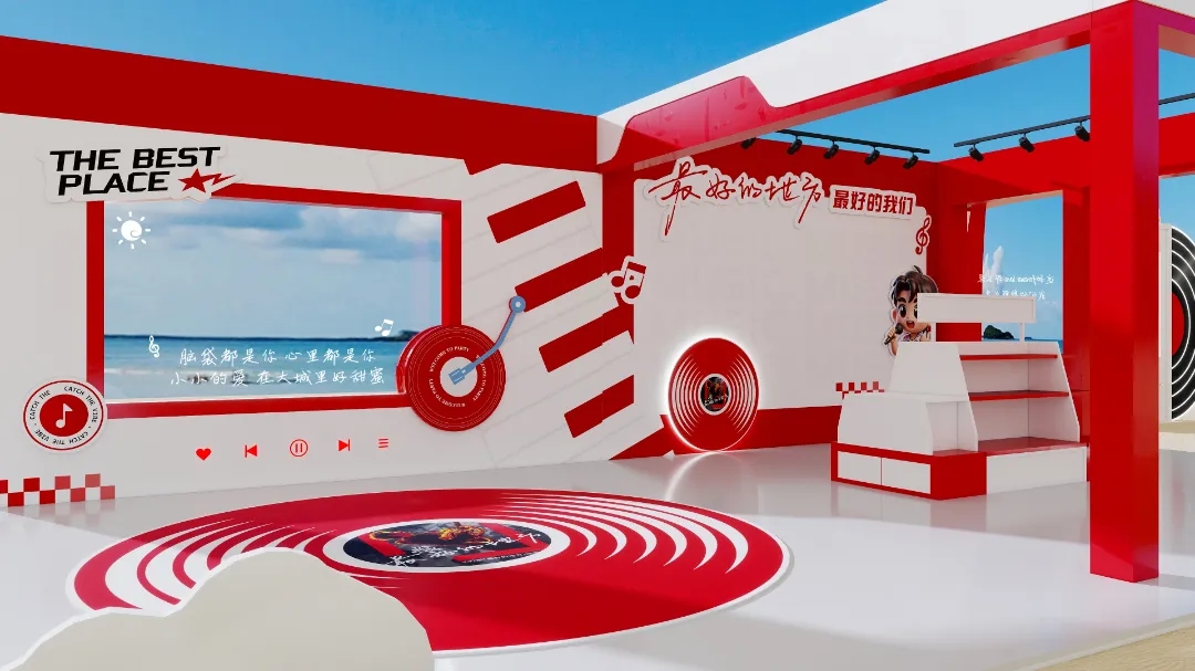 活动现场以 “新潮、灵动、喜庆” 为基调,用红白配色打造高级感视觉,音乐符号、透明装置与海岸线交织,随手一拍就是大片!