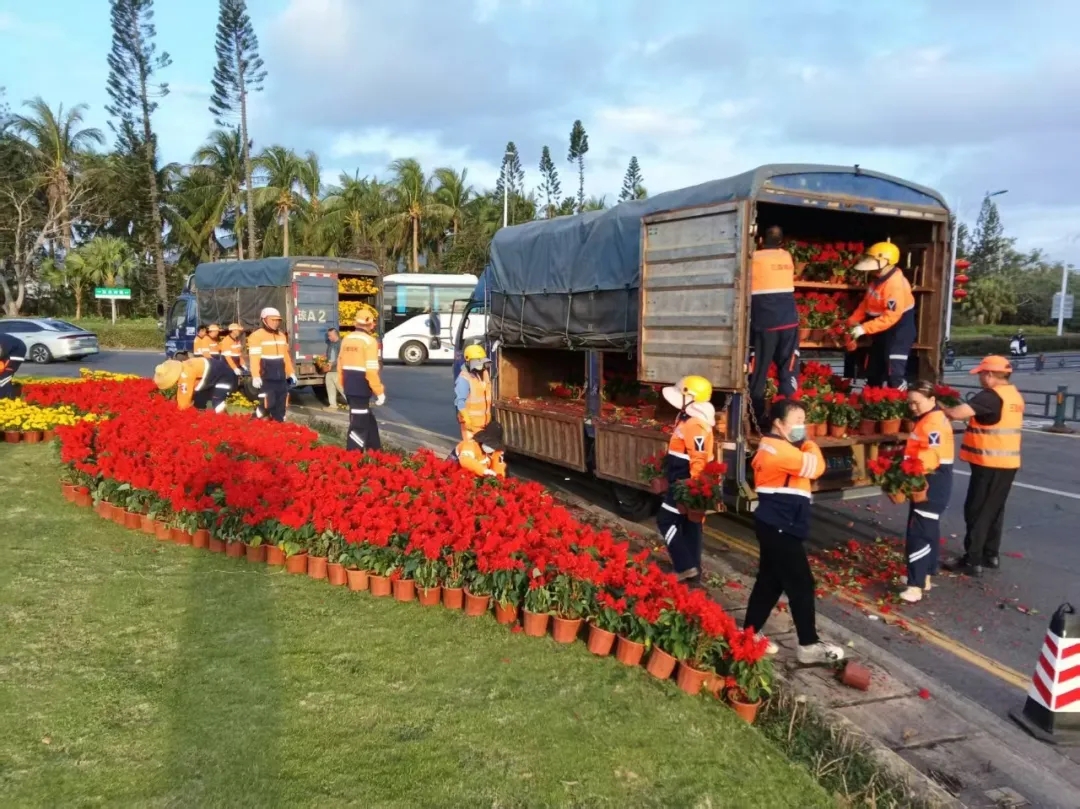 为了在新春佳节前完美呈现花景盛宴,工作人员全力以赴,历经2天的昼夜奋战、精雕细琢,将一簇簇精心挑选的草花错落有致地铺展在亚龙湾转盘各处。