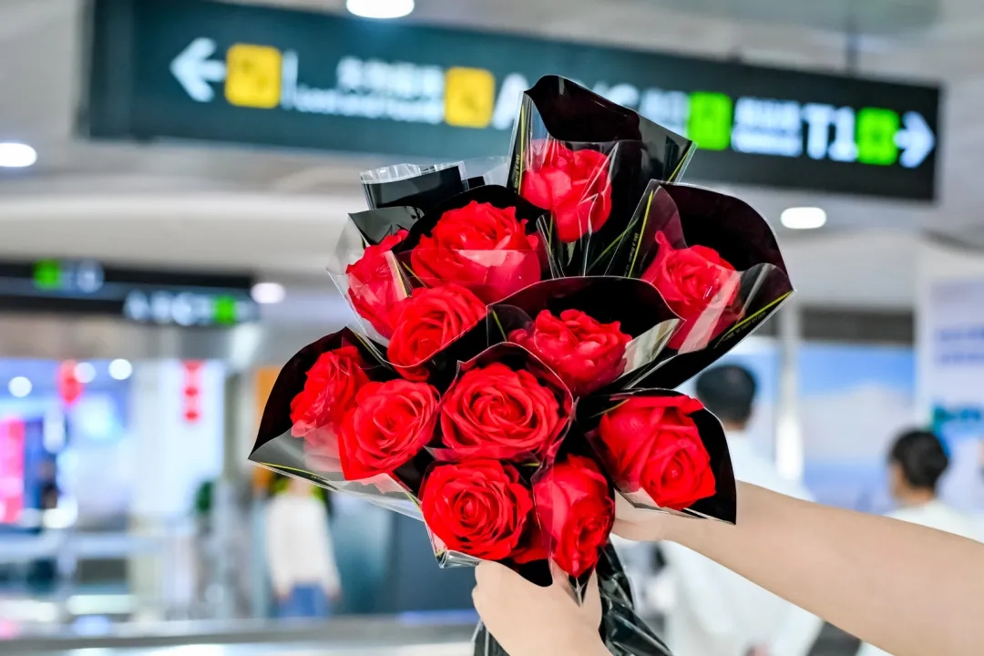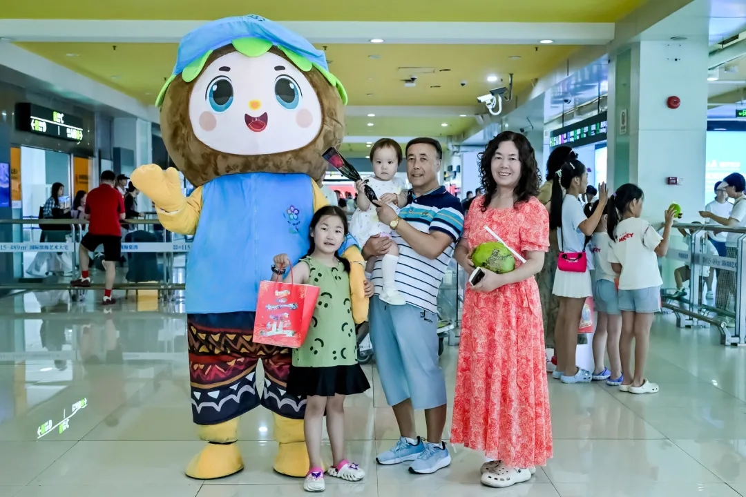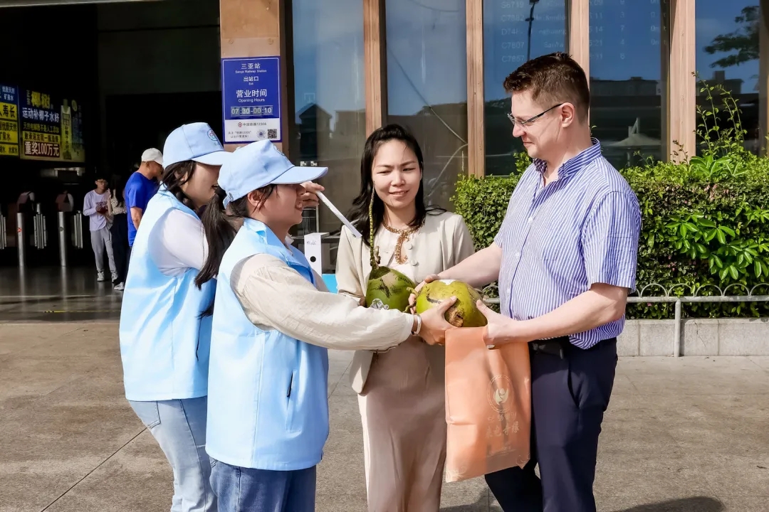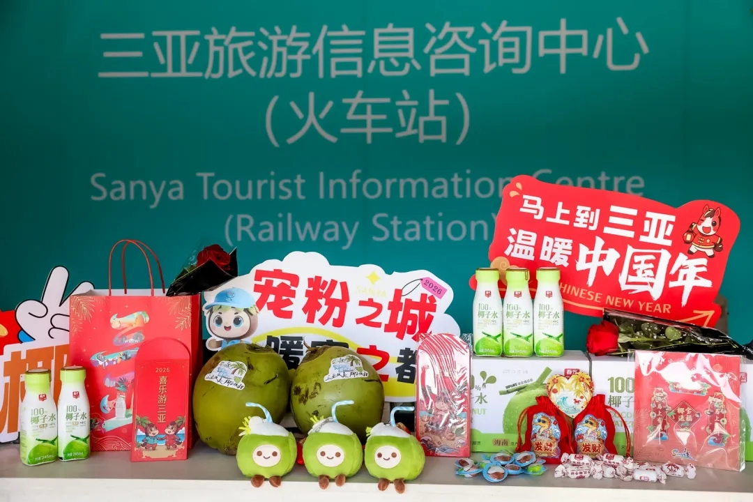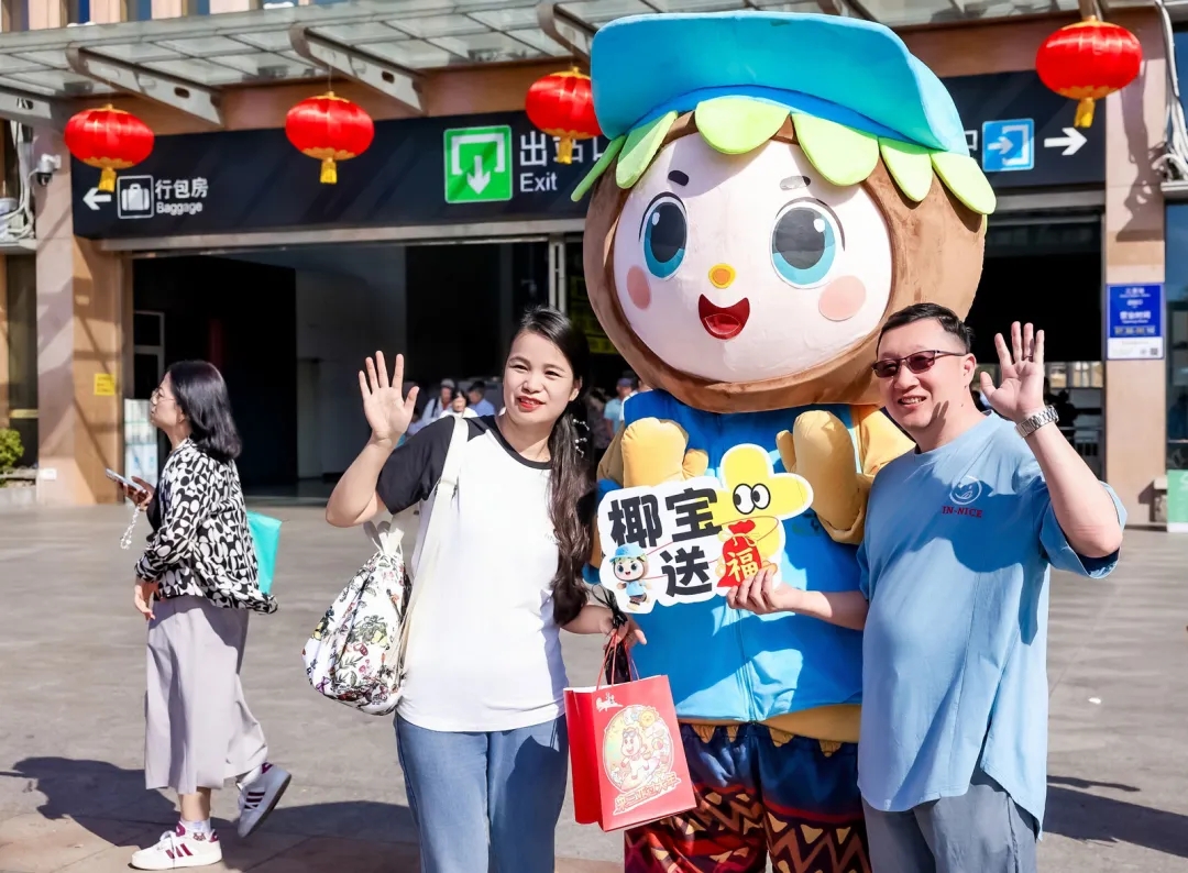 活动现场,旅客抵达三亚后,便有机会收到由身着“椰宝”玩偶服的志愿者送上的新春惊喜礼包。机场到达厅与动车站出站口设立的“暖客服务站”已准备就绪,为今日抵达的游客派送定制礼袋与海南青椰,礼包中更特别附赠一支玫瑰,为情侣游客增添甜蜜节日惊喜。