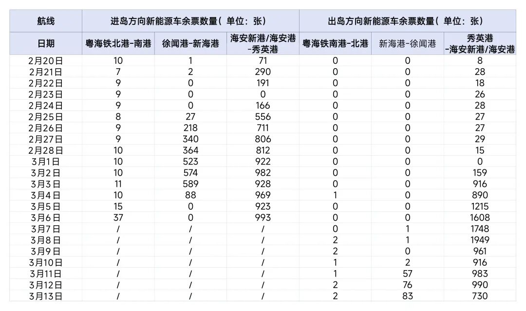 温馨提醒:余票随销售情况随时变动。琼州海峡已实行车辆过海全预约,请有出行计划的司机、旅客提前通过“琼州海峡轮渡管家”“徐闻港”“铁路轮渡”微信公众号预约购买船票,并按照船票时间在规定的时段到达港口,以免影响出行。建议有出行计划的司机旅客合理安排行程,错峰出行。