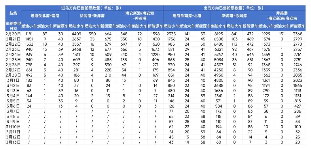 春运期间琼州海峡客滚运输船票预售情况(截至2月20日7:00)