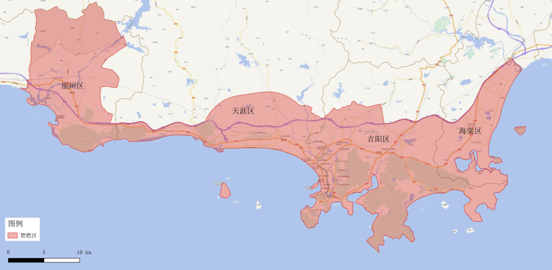 东至海棠区椰林路,西至崖州区城东村,北至G98高速(含吉阳区红花村、三汤村,天涯区水蛟村、羊栏村、槟榔村、南岛居委会,崖州区北岭村、赤草村、南滨社区、南雅社区),南至大海(含西岛旅游区、蜈支洲岛旅游区)(详见下图)。