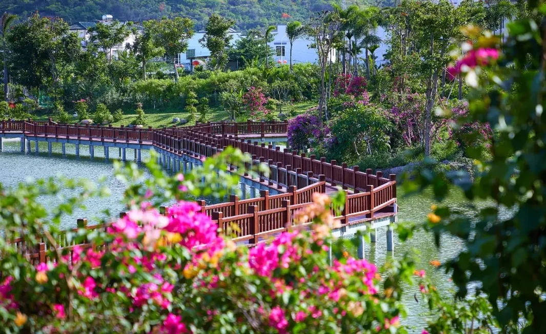 春风拂过,位于吉阳区博后村的哎岬湖,被花儿装扮得格外美丽。