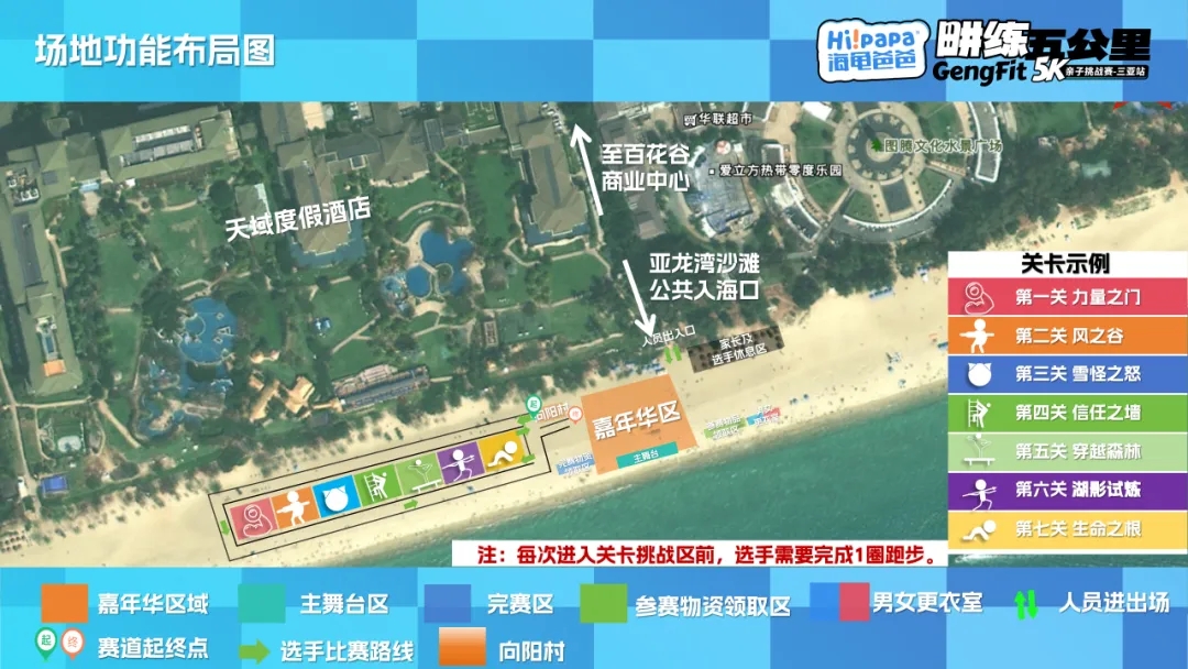 赛事依托亚龙湾绝美沙滩风光,精心设计“力量之门” “风之谷” “雪怪之怒” “信任之墙” “穿越森林” “湖影试炼” “生命之根” 7大主题关卡,覆盖上肢力量、核心稳定、平衡协调、精准投掷、毅力耐力等多元训练维度。小勇士们在奔跑与挑战中锻炼体能、磨砺意志。