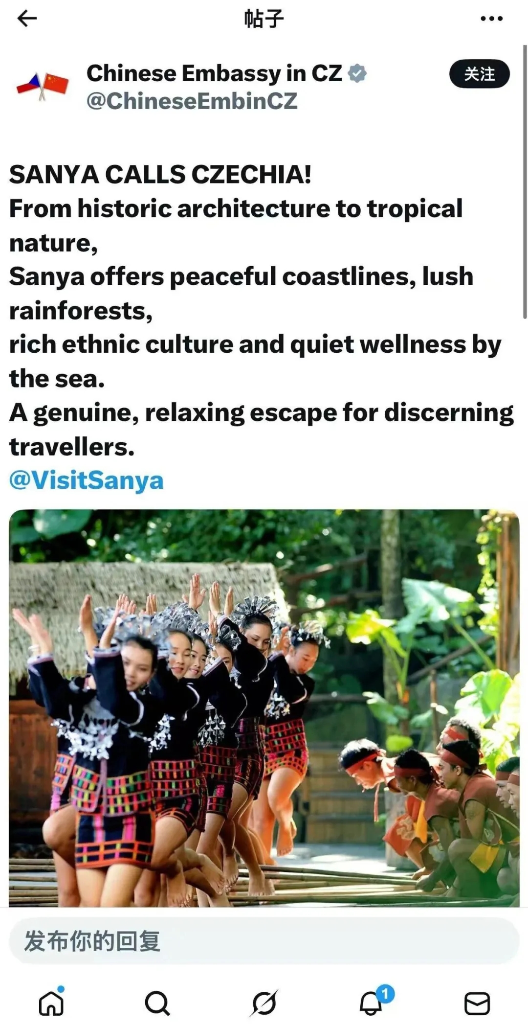 近期三亚在欧洲开展持续宣推,引发欧洲文化旅游界持续关注,三亚的城市形象在欧洲柏林、布拉格等重要城市得到显著提升。三亚良好的城市旅游旅形象也得到了中国驻德国大使馆、中国驻捷克大使馆的关注与推介。