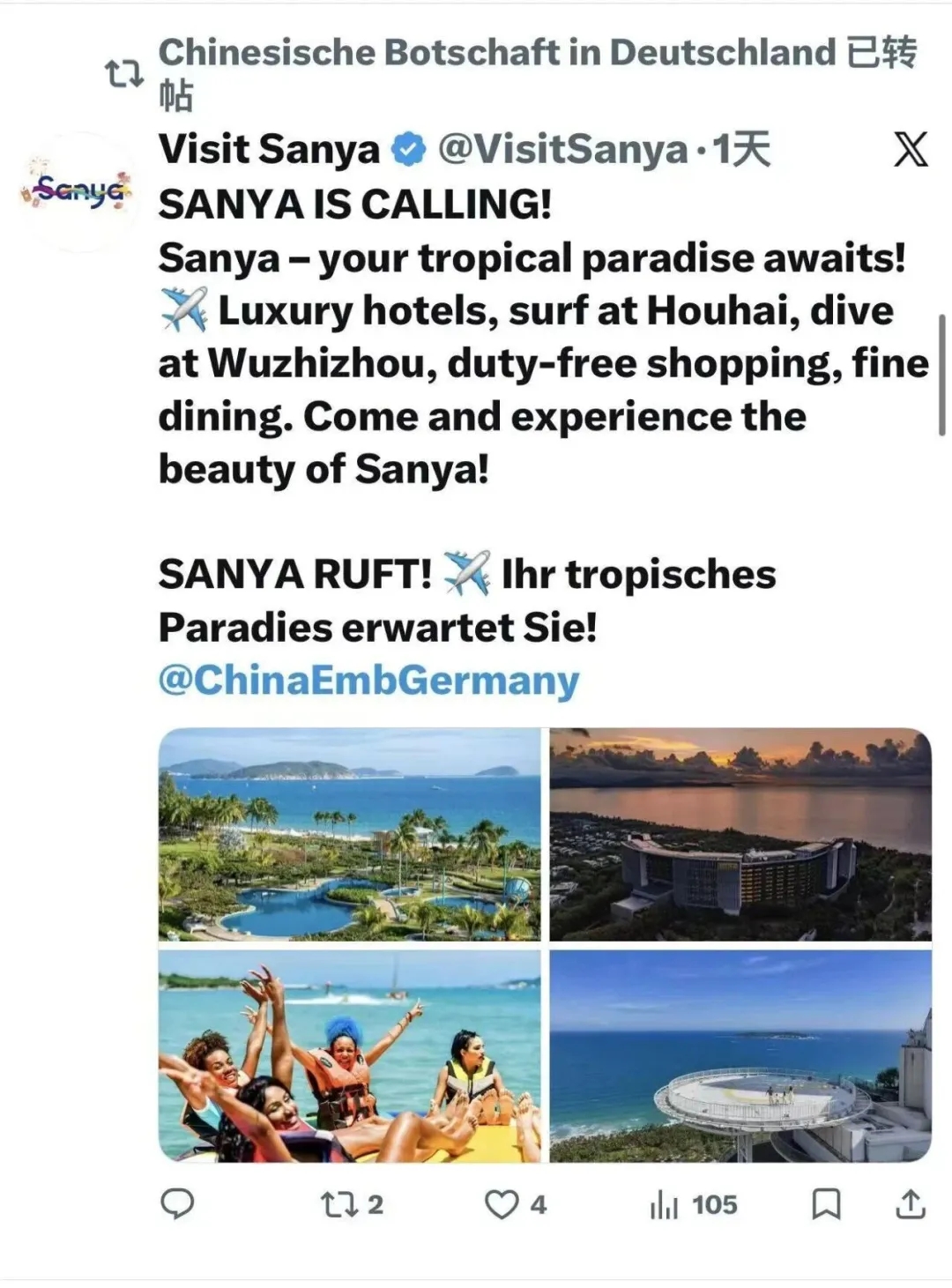 三亚作为国际旅游目的地,魅力与潜力在“国家级外交窗口”获得的实力认证。从“走出去”推广到“被看见”后获得官方认证推荐,三亚的国际影响力正在悄然开启一场质的飞跃。