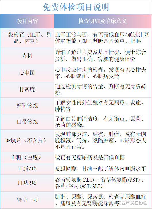 身高体重、血压、肝功二项、血脂二项、空腹血糖、肾功三项、内科、妇科检查、白带常规