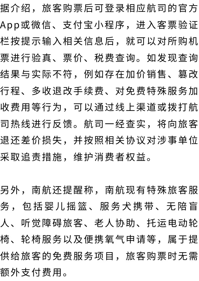 旅客通过第三方平台购买机票,想知道所购机票是否遭遇加价销售、篡改行程,可以登录航司官方App或微信、支付宝小程序进行机票信息查询验证。如果第三方平台存在这些行为,旅客可以直接向航司进行反馈维护自己的权益。