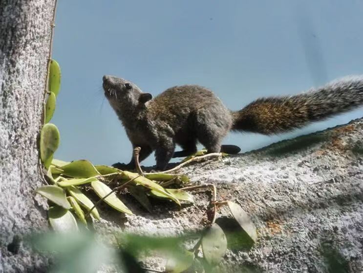 树洞探出头,鼻子闻新芽,叼野果窜枝头,大尾巴扫叶“唰唰”响。