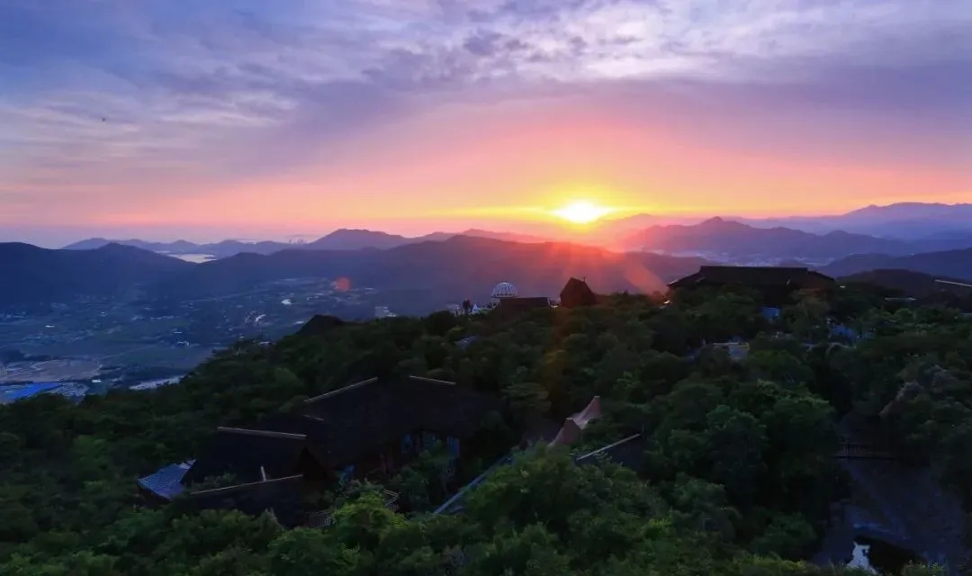 山顶巨型青铜龙盘踞山脊,春天新绿从鳞甲缝钻出来,像给它披花衣裳。