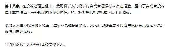《办法》第十八条明确,投诉人投诉不实,旅游投诉处理机构可以终止调解,切实保障旅游企业的合法权益;增加对不配合投诉处置的企业实施信用管理的措施,有利于营造“守信光荣、失信可耻”的良好运营环境,提高全行业守信经营水平,进而提升旅游者满意度,推动行业高质量发展。