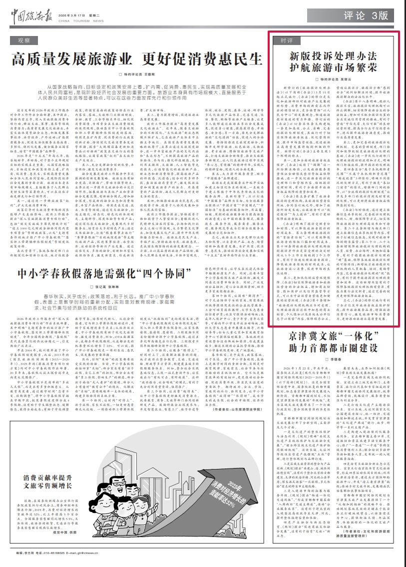 《办法》的修订是文化和旅游部针对旅游产业发展的新形势、消费市场的新需求而作出的精准回应,是全面贯彻“以人民为中心”的发展理念,畅通旅游投诉渠道的有力举措。修订后的《办法》以32条具体条文构建起一套更加高效、公正、清晰、完善的投诉处理制度,其施行对于切实保障旅游者权益、优化营商环境、提升市场监管效能,促进旅游业高质量发展将起到积极的作用。