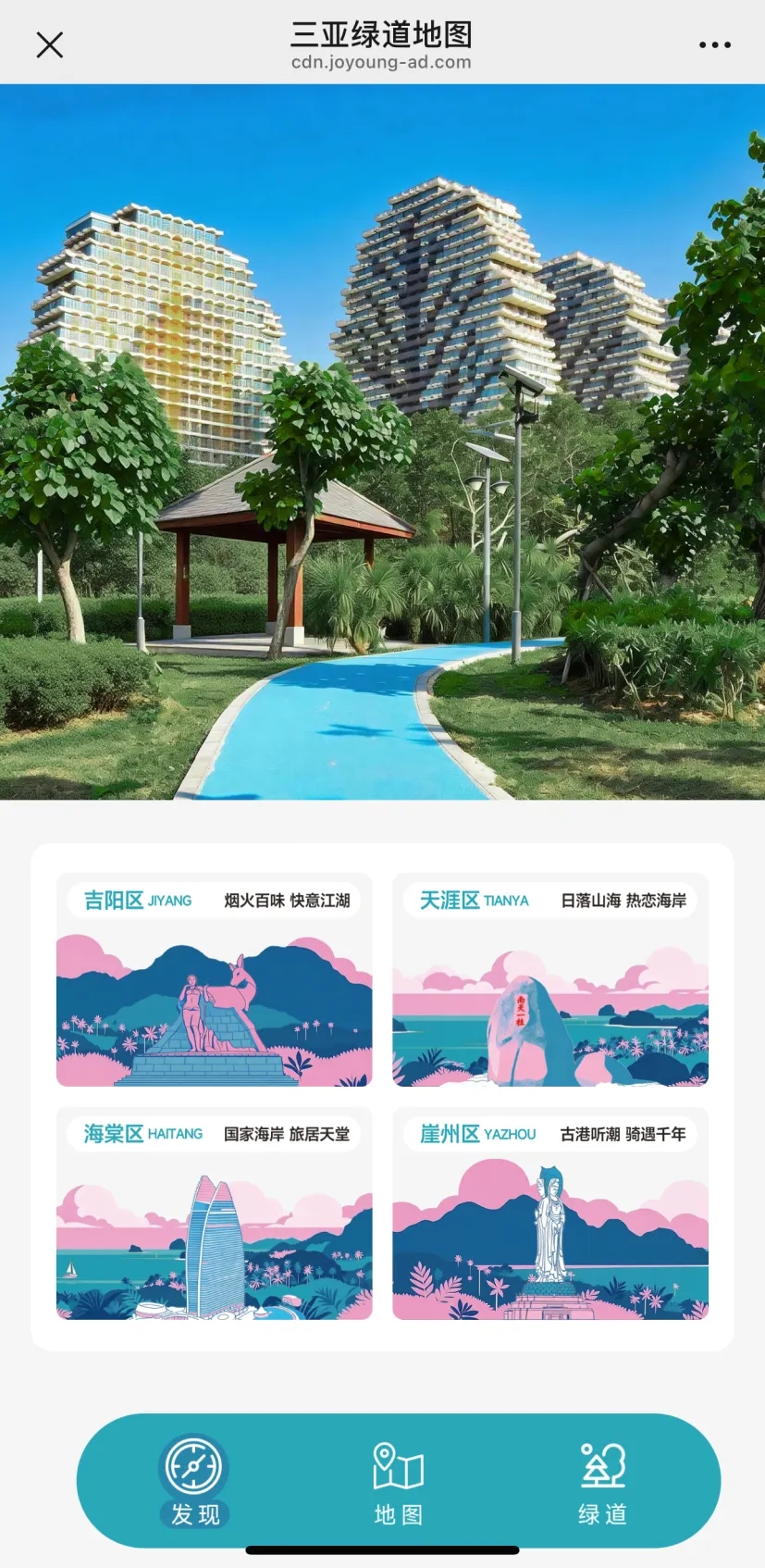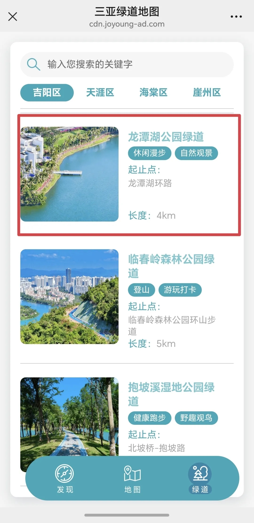 分区导览:涵盖吉阳区、天涯区、海棠区、崖州区,方便查看每个区的绿道布局。