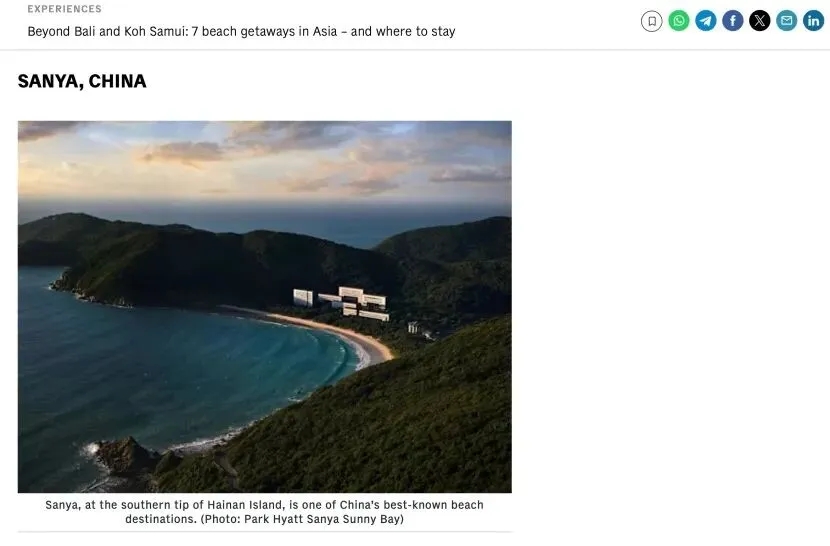 新加坡国家级媒体亚洲新闻台(CNA)头版盘点亚洲顶尖海滩度假胜地,三亚成为唯一入选的中国滨海城市,超越巴厘岛、苏梅岛的高端私享体验,成为亚洲滨海度假的中国标杆。