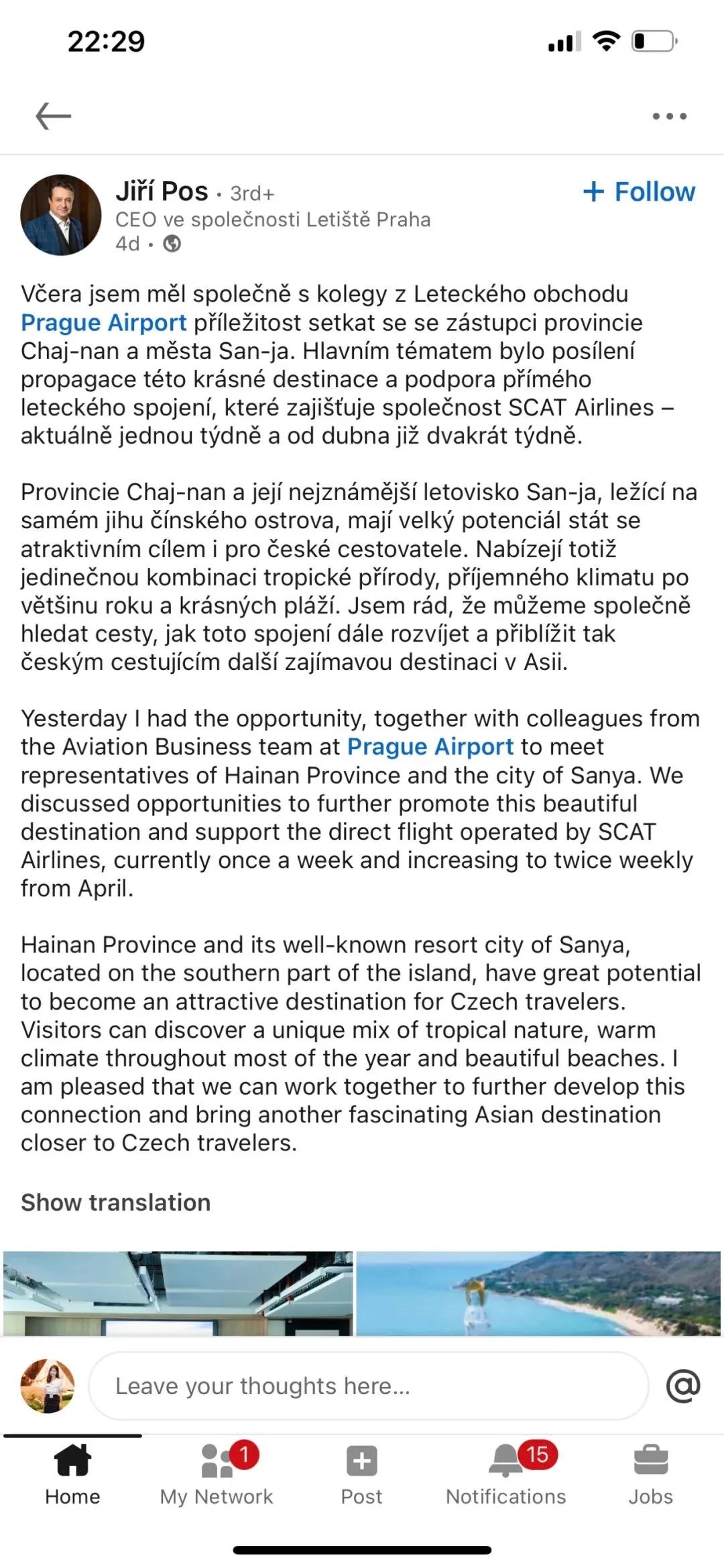 布拉格机场CEO Jiří Pos在领英发文盛赞三亚,称其热带风光、温暖气候与绝美海滩的独特组合,极具潜力成为捷克游客的热门目的地,还携手推动布拉格至三亚航线加密,让欧洲与三亚的高端文旅连接更紧密。
