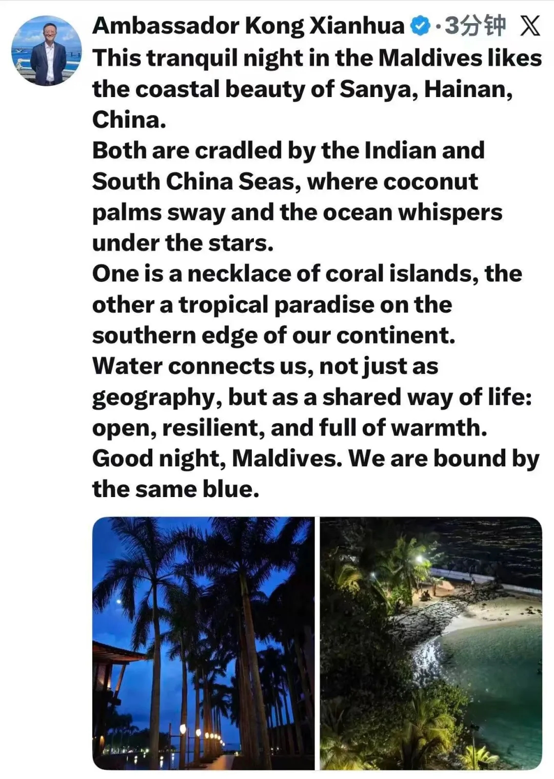 中国驻马尔代夫大使孔宪华将三亚海岸线与世界顶级度假目的地马尔代夫相类比,直言二者“共享同一片蓝”,让三亚的热带滨海高端度假魅力,被全球网友看见。